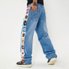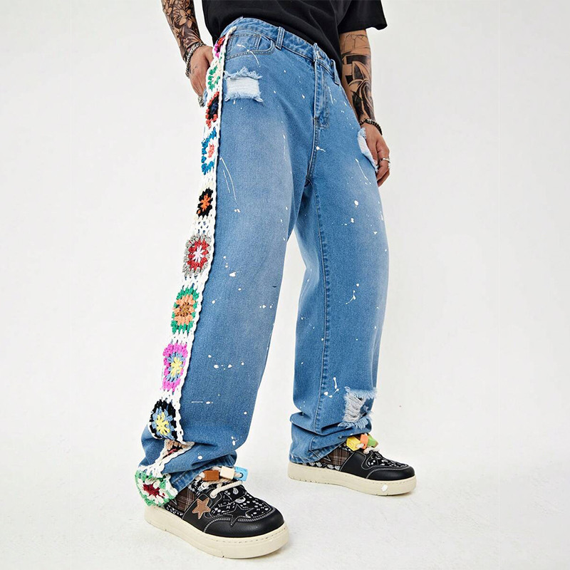 These light blue wide-leg jeans blend vintage vibes with street flair, featuring hand-crochet side panels, distressed rips, and a bold, artistic look that stands out from the crowd.