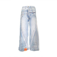 DiZNEW's wide-leg jeans feature a bold patchwork design and distressed detailing, offering a unique vintage look for streetwear enthusiasts.