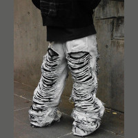 Custom distressed white wide-leg jeans with extreme rips, offering a bold punk streetwear style and tailored custom services.