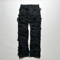 Strip patches jeans with distressed details and tailored wholesale services for urban streetwear brands. Unique and bold design.