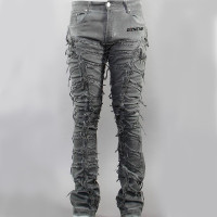 Distressed stacked jeans with tailored wholesale options. Perfect for urban streetwear brands seeking bold, customizable denim designs.