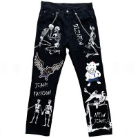 Custom screen-printed jeans in black denim with artistic graphics. Tailored bulk options for streetwear and creative brands.
