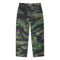 Premium denim featuring high-definition digital tiger stripe camo print. Custom military-inspired design with contemporary streetwear aesthetic