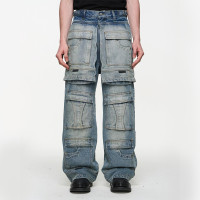 Bespoke wide-leg denim featuring innovative layered panels and multiple utility pockets. Premium light wash with architectural details