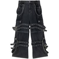 Edgy black denim jeans with buckle straps, metal eyelets, and a wide-leg fit for a bold gothic punk streetwear look.