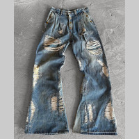 - Custom distressed wide-leg jeans with heavy ripping and vintage wash for a bold streetwear look.