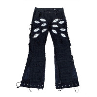 Custom gothic denim jeans featuring white eye appliqués, intricate distressed textures, and bold avant-garde detailing for luxury fashion.