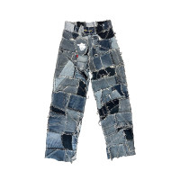 Custom patchwork denim jeans with raw edges, artisanal craftsmanship, and vintage appeal. Perfect for boutiques and luxury brands.