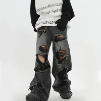 Custom ripped distressed denim jeans with embroidered stitching patches, chain details & raw edges for a bold streetwear look.