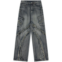 Custom Vintage Washed Distressed Fashion Patchwork Wide-Leg Denim