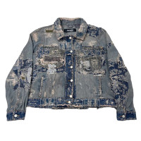 DIY patchwork denim jacket with heavy distressing and raw-edge stitching—bold, artistic, and uniquely handcrafted.