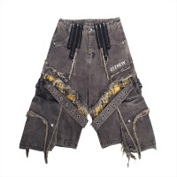 - High-street cotton denim shorts with distressed plaid patchwork, rivets, and zipper details. OEM/ODM available.