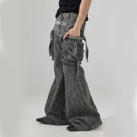 Gray flared cargo jeans with oversized utility pockets and washed finish. Streetwear statement with custom design.