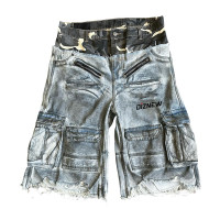 Custom denim cargo shorts with camo waistband, raw hem, and multi-zip pockets. Rugged streetwear style.