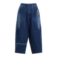 Tailored denim cargo pants with raw-edge patches and utility flair for curated, fashion-forward collections.
