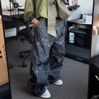 Baggy denim jeans with bold rivet details and circular patchwork, perfect for high-street fashion and custom branding.