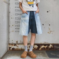 Avant-garde denim skort with contrast wash and raw hem—crafted for curated boutique edits and bold designer lines.