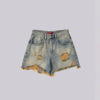 Heavily distressed denim shorts with raw edges, crafted for bold designer streetwear collections.
