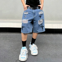 Statement custom denim shorts with ripped panels and star appliqué—crafted for standout streetwear edits.