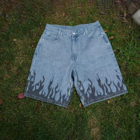 Bold flame-print denim shorts for a street-ready, edgy summer look. Fire up your fits.