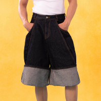 Oversized silhouette meets clean lines. A bold cuffed denim short with structural calm.