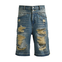 Heavy-distressed custom denim shorts with edgy rips, frayed layers, and metal studs for premium streetwear lines.