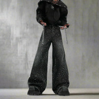 Bold sparkle, total power—black denim wide-leg jeans with all-over rhinestones and glam belt.