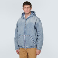 Sleek zip-up denim hoodie designed for high-street brands seeking timeless, unisex outerwear pieces.
