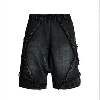 Custom oversized distressed denim shorts with raw seams and bold structure, street-luxury ready.