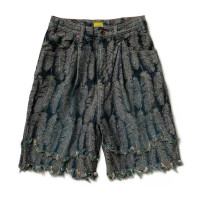 Custom denim shorts with feather-textured fabric and raw hem. Built for curated fashion retailers & designers.
