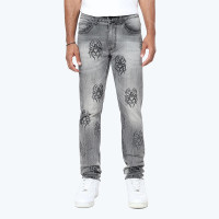 Men's Gray Straight-Leg Jeans with Tribal Flame Embroidery – Street Edge Style