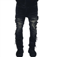These slim-fit black jeans feature raw side fringe and grunge-inspired destruction—crafted for boutique labels and designers seeking a rebellious aesthetic with premium details.