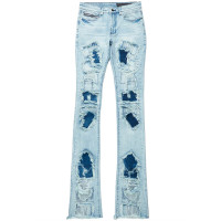 Custom Flared Distressed Patch Jeans in Light Wash Denim