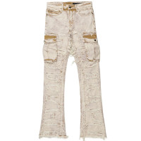 Beige flared cargo jeans with oversized pockets and distressed panels. Built for bold designer and boutique streetwear.